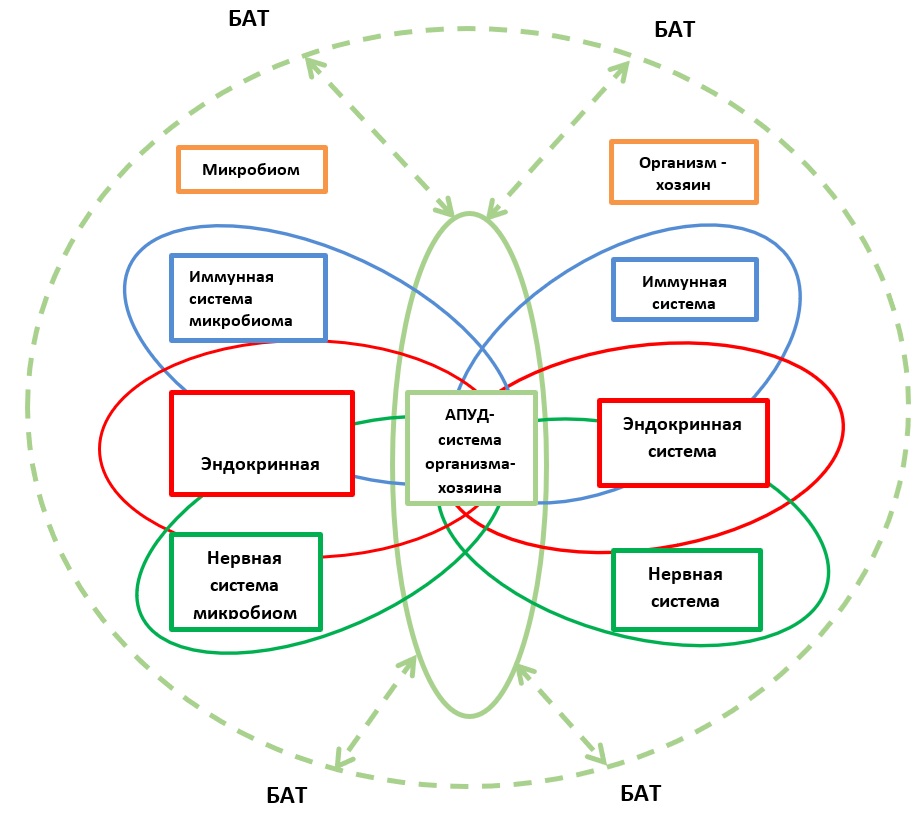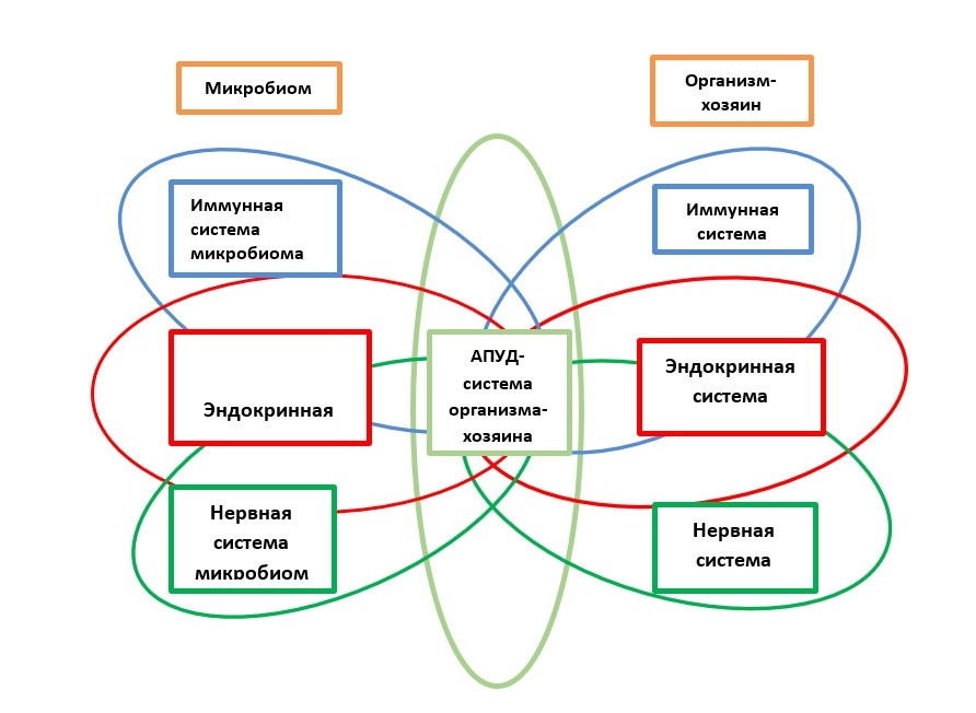Микроорганизмы микробиома, структурно располагаясь на внешней стороне эпителиальных и кожных поверхностей и непосредственно взаимодействуя с окружающей средой, метаболически неразрывно связаны с функциональными системами организма человека (организма-хозяина). Исходя из симбиотических взаимоотношений микроорганизмов микробиома с организмом – хозяина, и огромности генетического материала микробиома, логичным представляется предположение о формировании последним функциональных аналогов нервной, иммунной и эндокринной систем. В таком представлении механизм функционального взаимодействия систем микробиома и организма-хозяина лучше всего объясняется наличием АПУД – системы организма-хозяина.