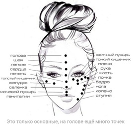 Рис. 3 Биологически активные точки на теле человека, в данном примере на лице.