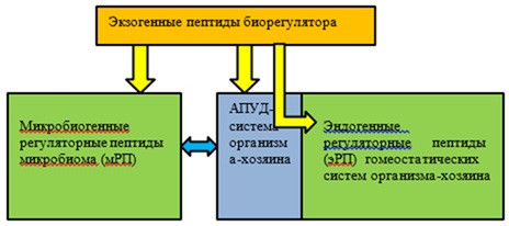 определением влияния ВМГ (в первую очередь коротких экзопептидов) на живые системы (в том числе микроорганизмы и растения), клинические испытания, с уверенностью можем утверждать о наличии регулирующего влияния компонентов ВМГ на системы гомеостаза организма. Рассматривая короткие пептиды ВМГ в качестве экзогенных, относительно системы микробиом – организм-хозяина взаимосвязанной АПУД-системой, можно структурно представить направления воздействия биорегулятора, как показано на рис. 4.
